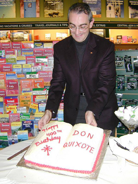 Jesús Ángel Miguel-García presents birthday cake to celebrate 400 years of Don Quixote as part of the Don Quixote Week organized by The Spanish Institute. McNally Robinson Bookstore. Winnipeg.